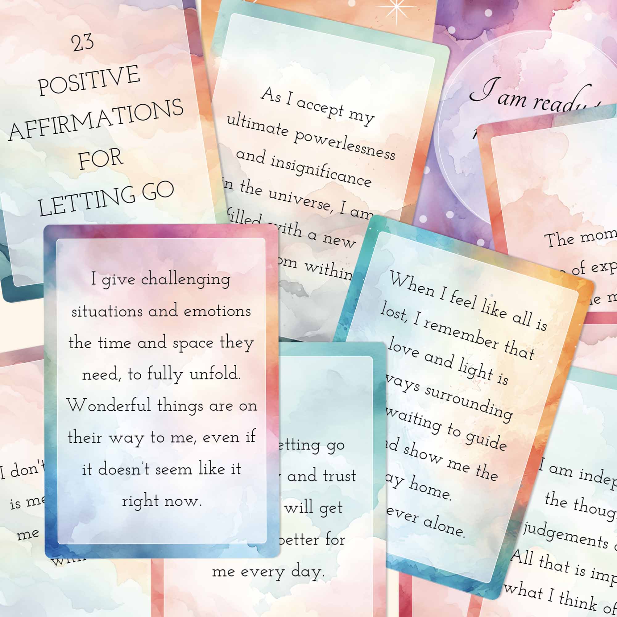 A set of 23 printable positive affirmation cards for letting go and stepping into the true power within you.