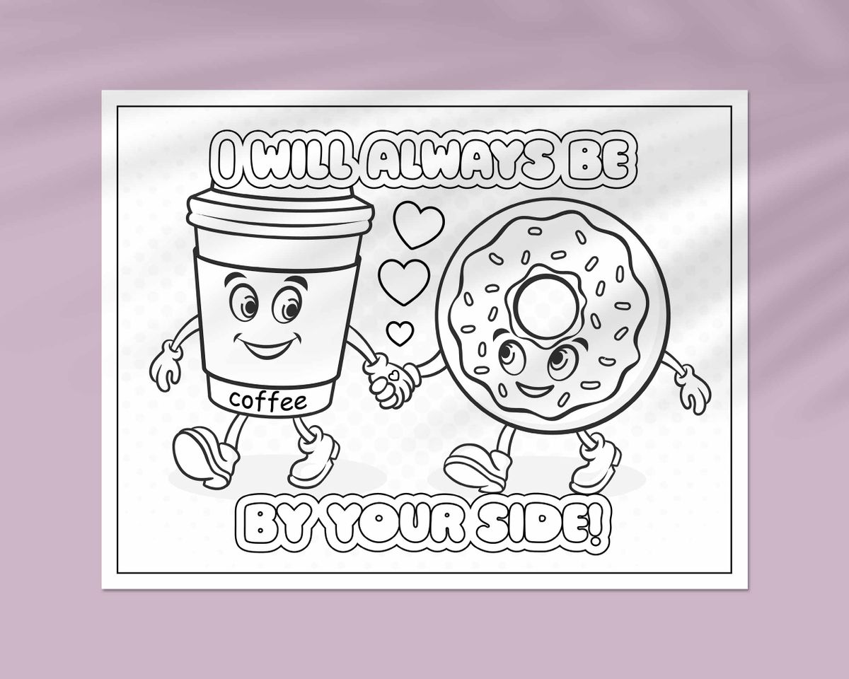 FREE printable cute donut coloring page with quote, “I will always be by your side!”