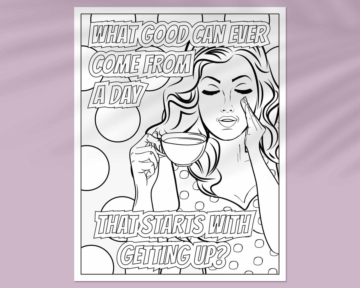 Printable coloring page with unmotivational quote, “What good can ever come from a day that starts with getting up?”
