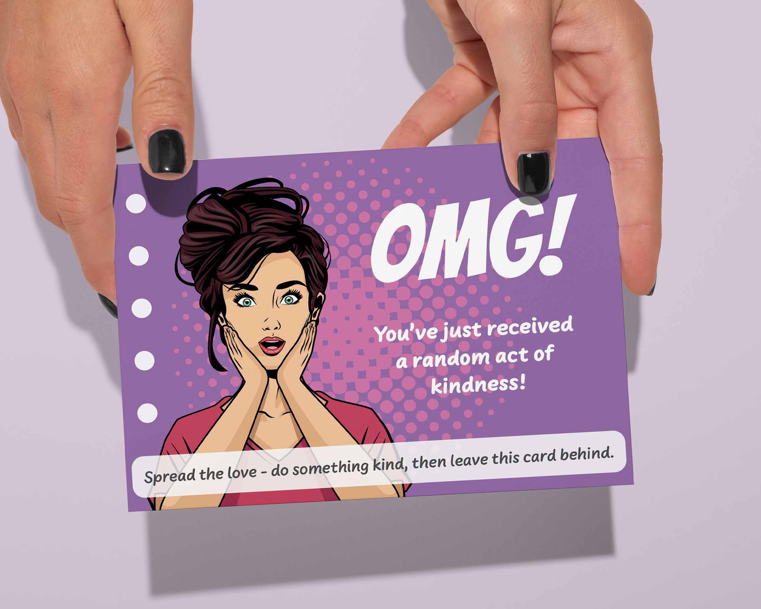 💜 Step back in time with this retro style random act of kindness card featuring a 'surprised' looking woman and the text, "OMG! You've just received a random act of kindness!" 💜