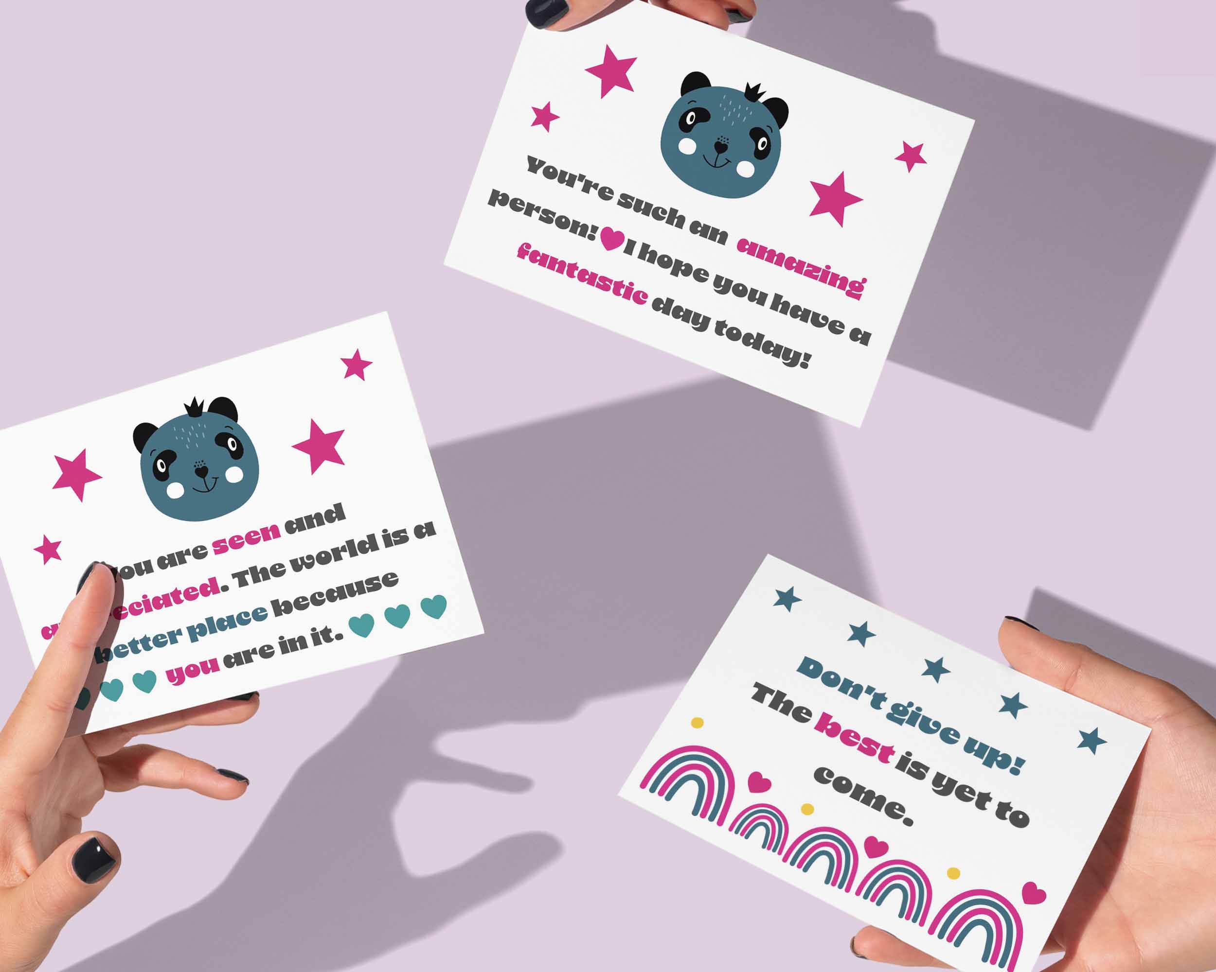 These kindness cards are provided in PDF format and are perfect for printing at home on A4 or US Letter paper. You can also choose between two different print layouts.