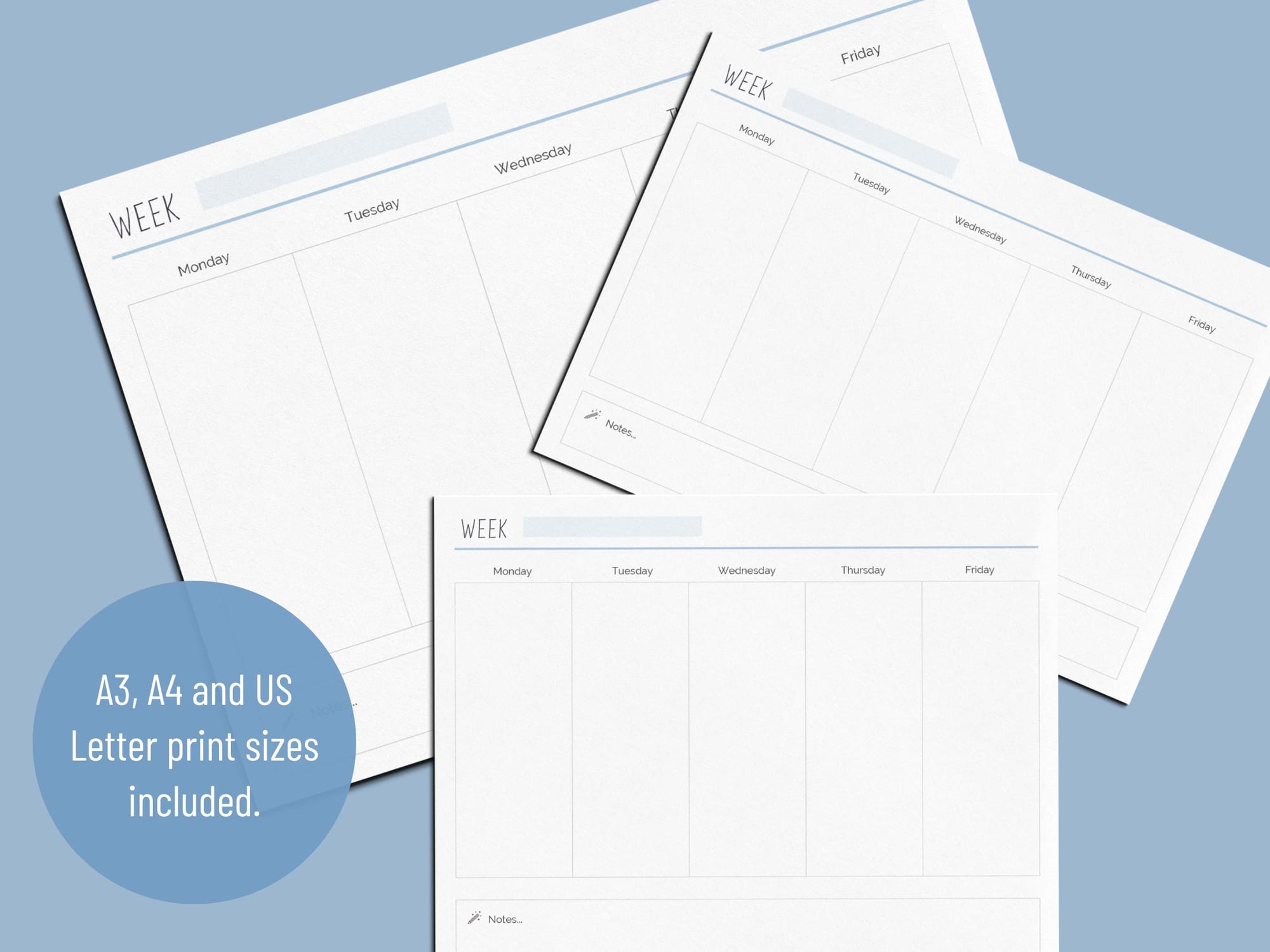 A free Monday to Friday 5 day planner. A3, A4 and US Letter print sizes are inlcuded. A simple and practical design, with space for notes.
