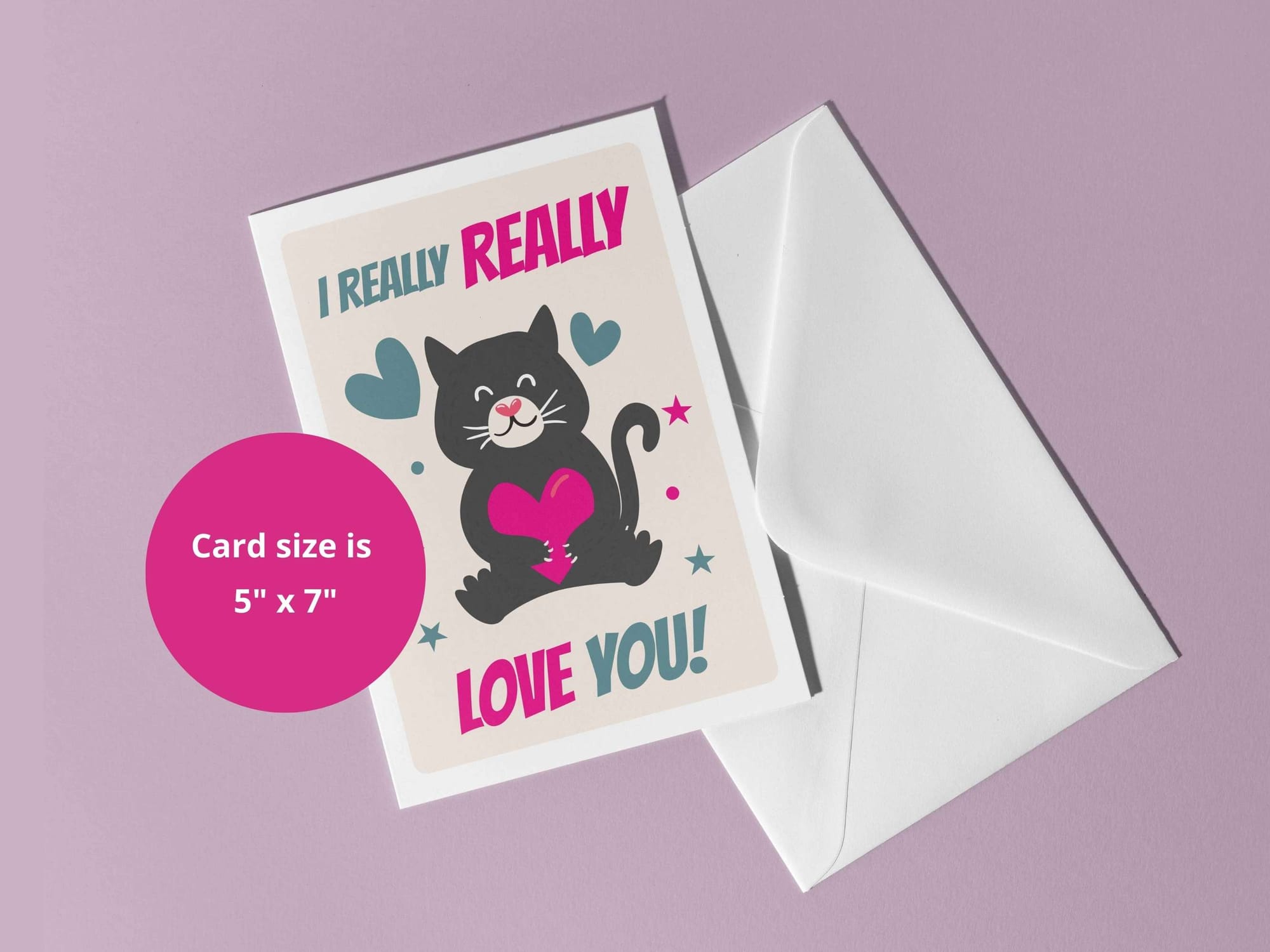 A cute, fun greetings card with a picture of a sweet cat holding a big heart. Perfect gift for a boyfriend, girlfriend, husband, wife, kids, friends and loved ones.