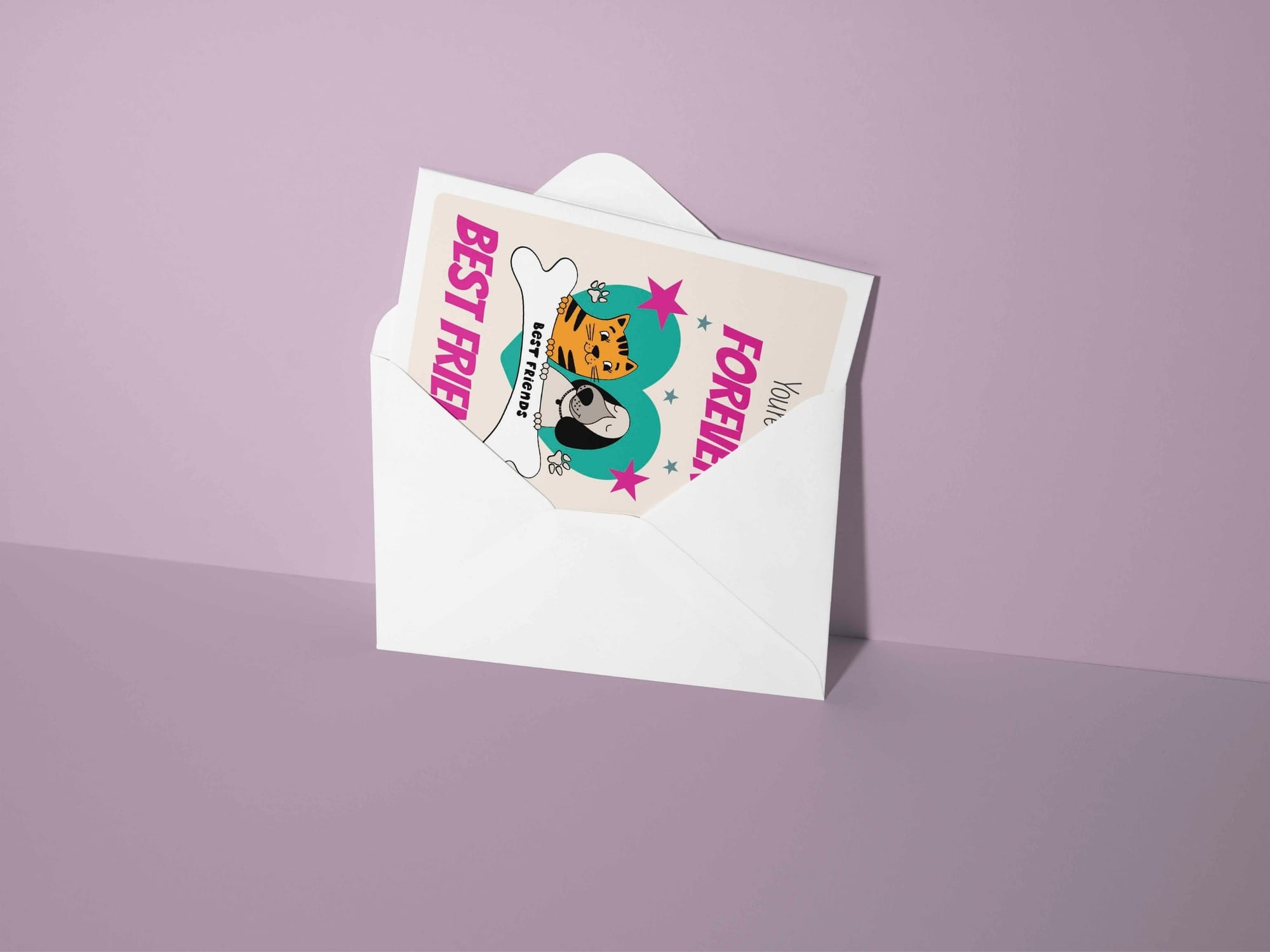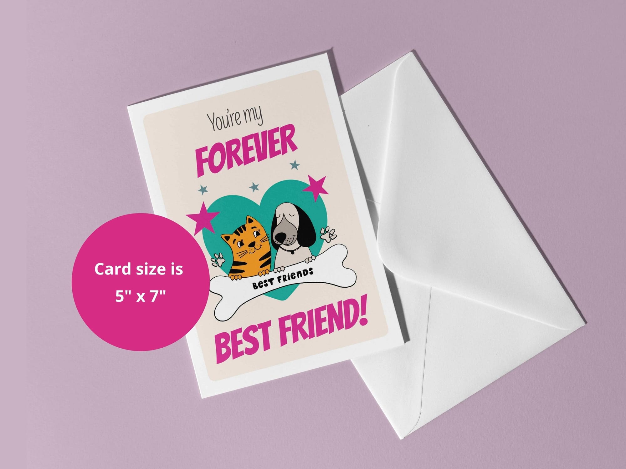 A cute, fun best friends greeting card with a picture of a sweet kitten and puppy in a heart. Perfect gift for a kids, teens and soft hearted adults.