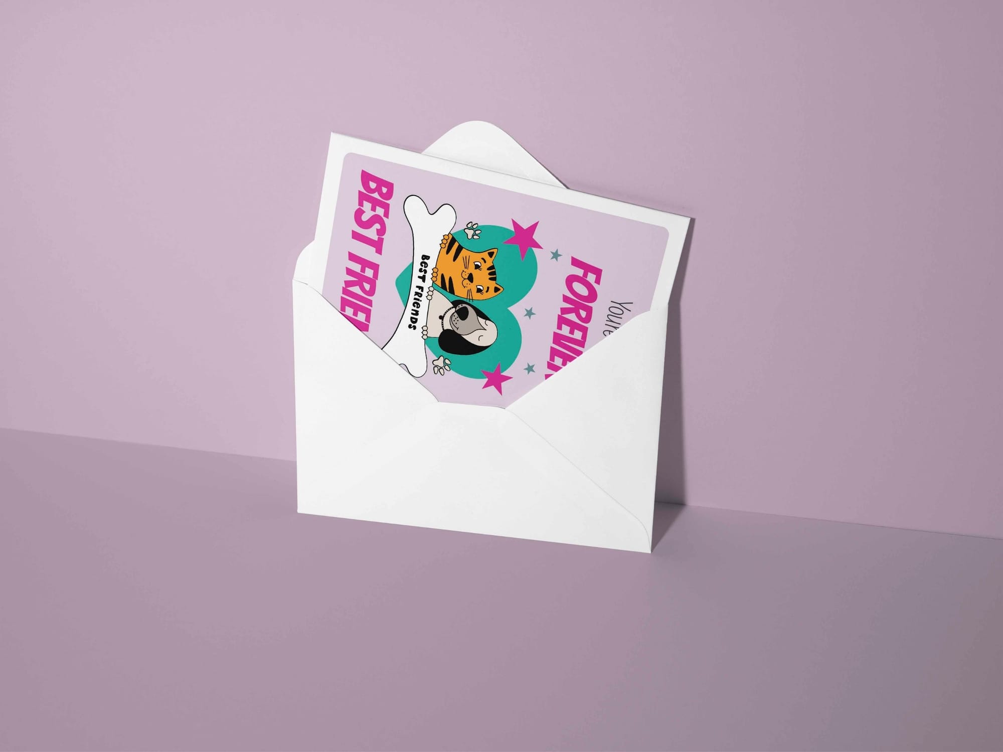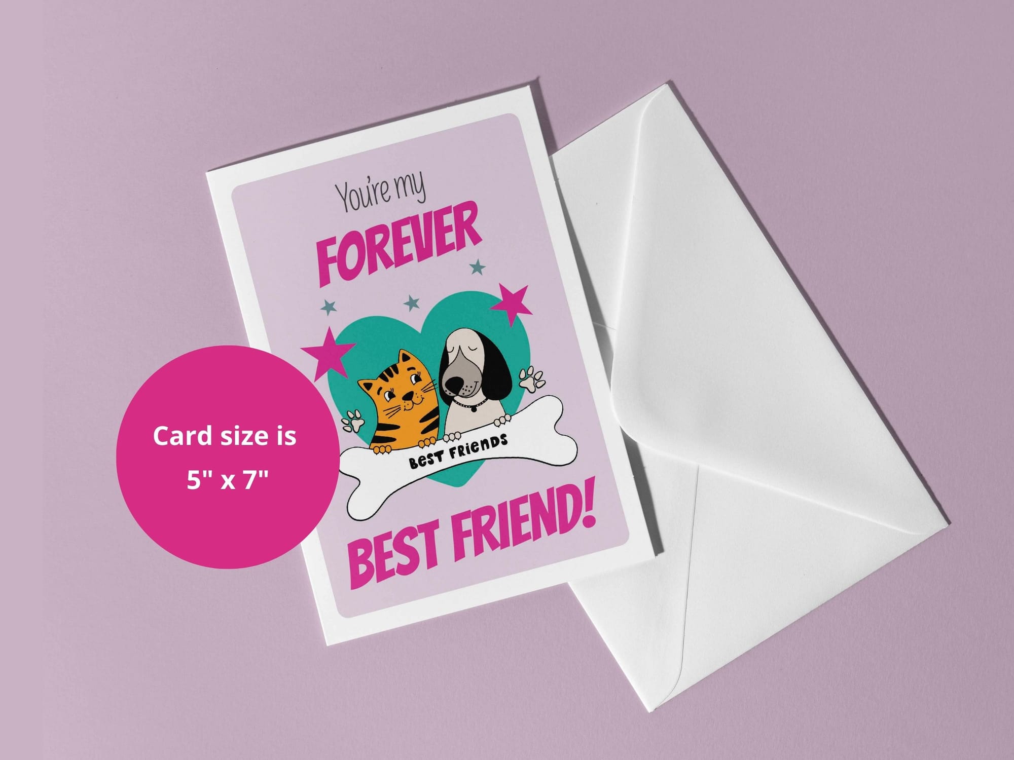 A cute, fun best friends greeting card with a picture of a sweet kitten and puppy in a heart. Perfect gift for a kids, teens and soft hearted adults.