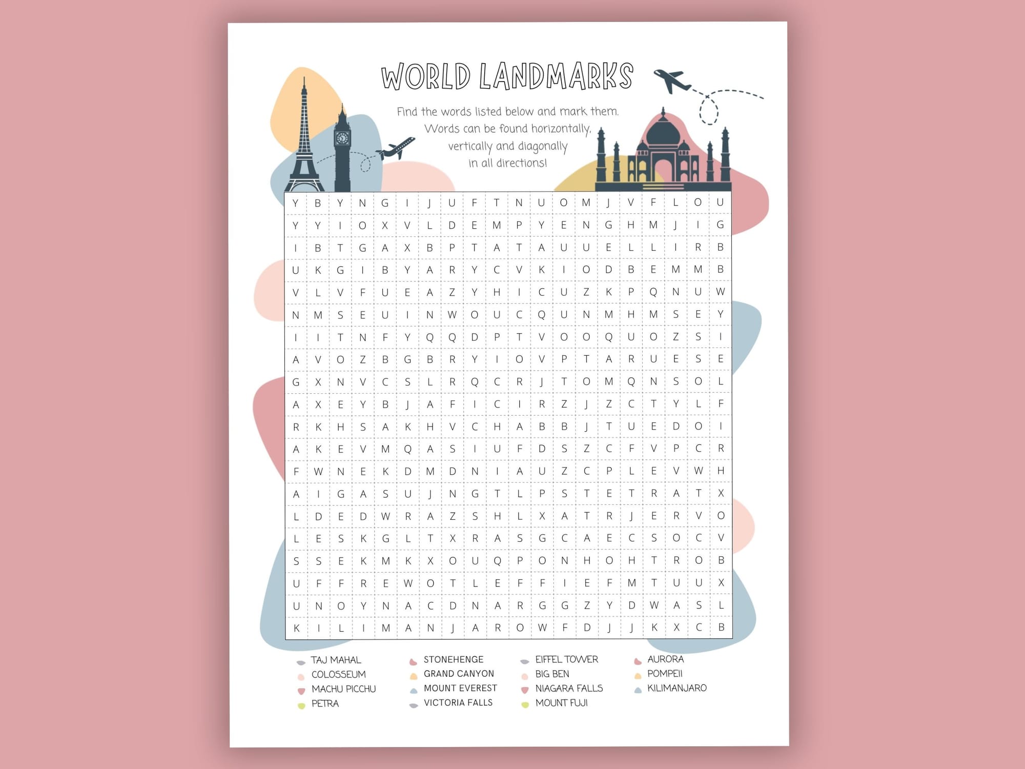 🏔️ A famous world landmarks themed printable word search with 15 words to find! Words can be found horizontally, vertically and diagonally. A useful activity for long car journeys, as well as at kids parties, for games or party bag fillers. 🏔️